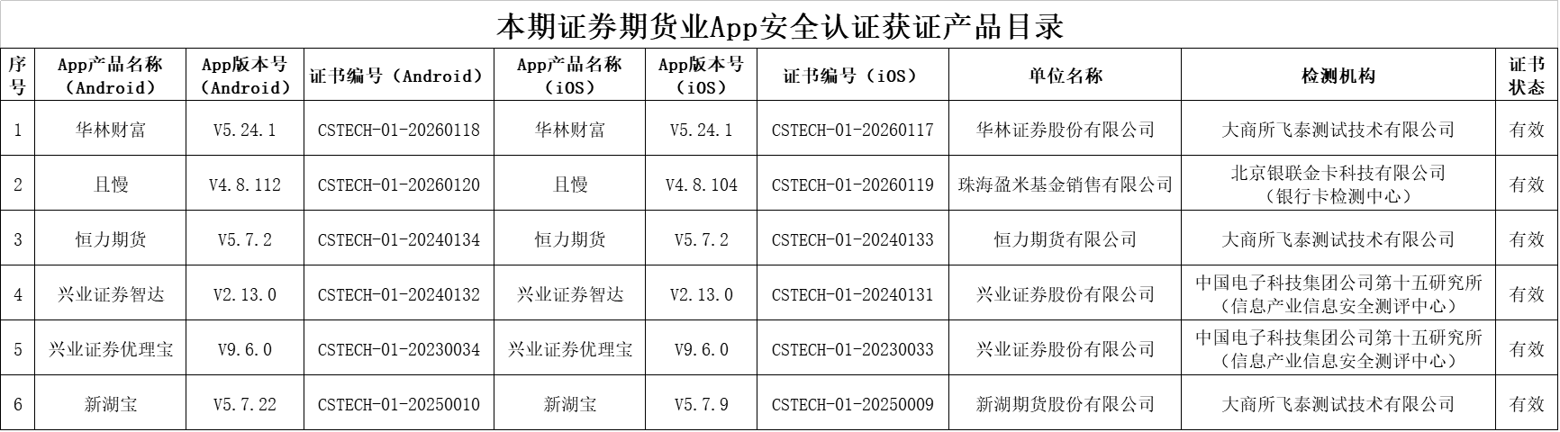 恒力期货有限公司的“恒力期货”App等4款通过认证监督审查,符合行业标准《证券期货业移动互联网应用程序安全规范》(JR/T 0192-2020)及《证券期货业移动互联网应用程序安全检测规范》(JR/T 0240-2021)要求,其认证证书持续有效。
